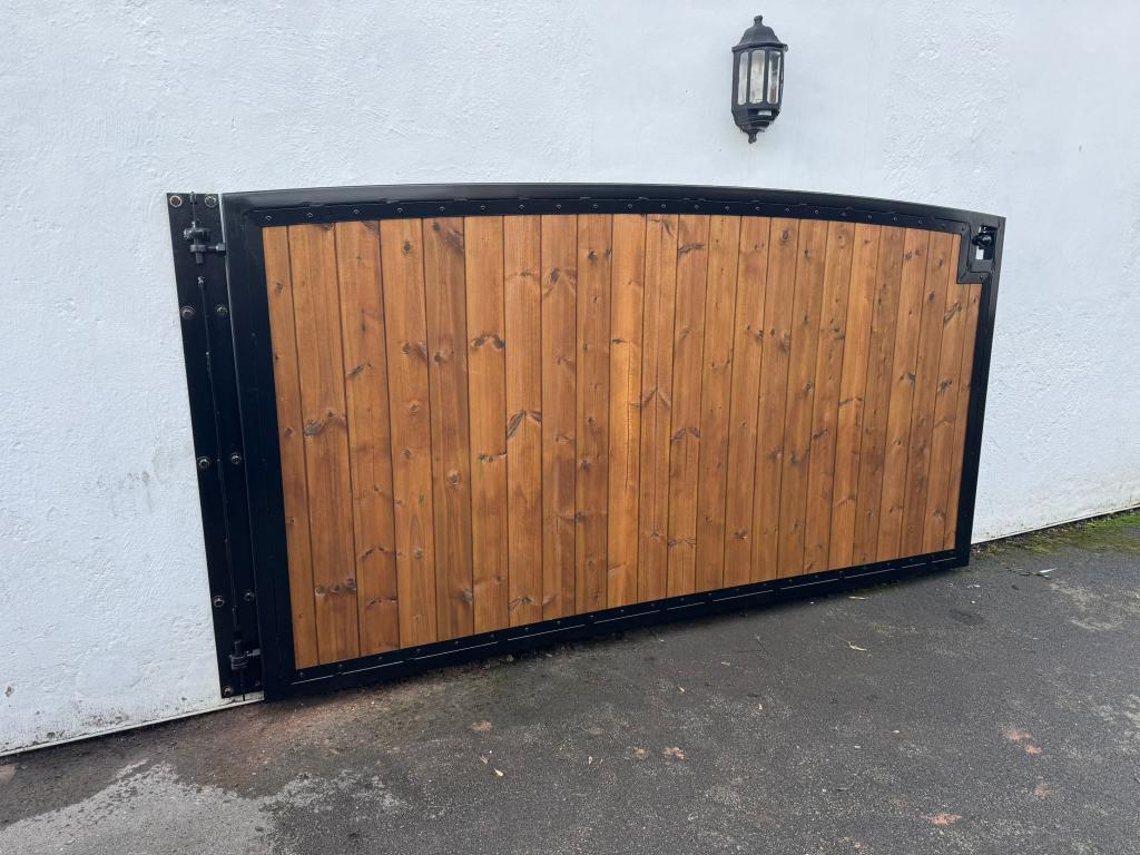 Bespoke steel framed gate infilled with vanished timber in Llangollen.